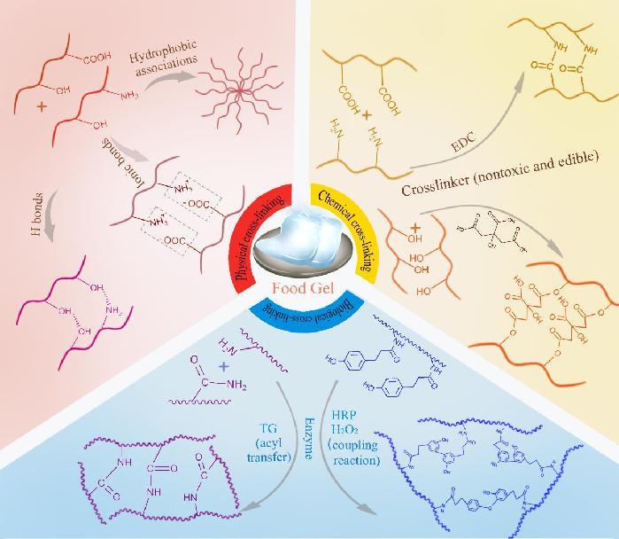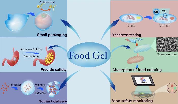 食品凝胶是介于固体和液体之间的柔软而富有弹性的高分子凝胶材料,在推动现代食品工业的发展发挥着极为重要的作用,已经广泛应用于食品智能包装、智能保鲜、新鲜度检测、营养递送、食用色素吸附、食品安全监测、饱腹产品开发等领域。食品凝胶具有可食用性、营养物质可搭配性、可再生性、低成本、生物相容性好以及生物可降解性等诸多特点,食品级材料的开发促进了新型食品凝胶的发展。