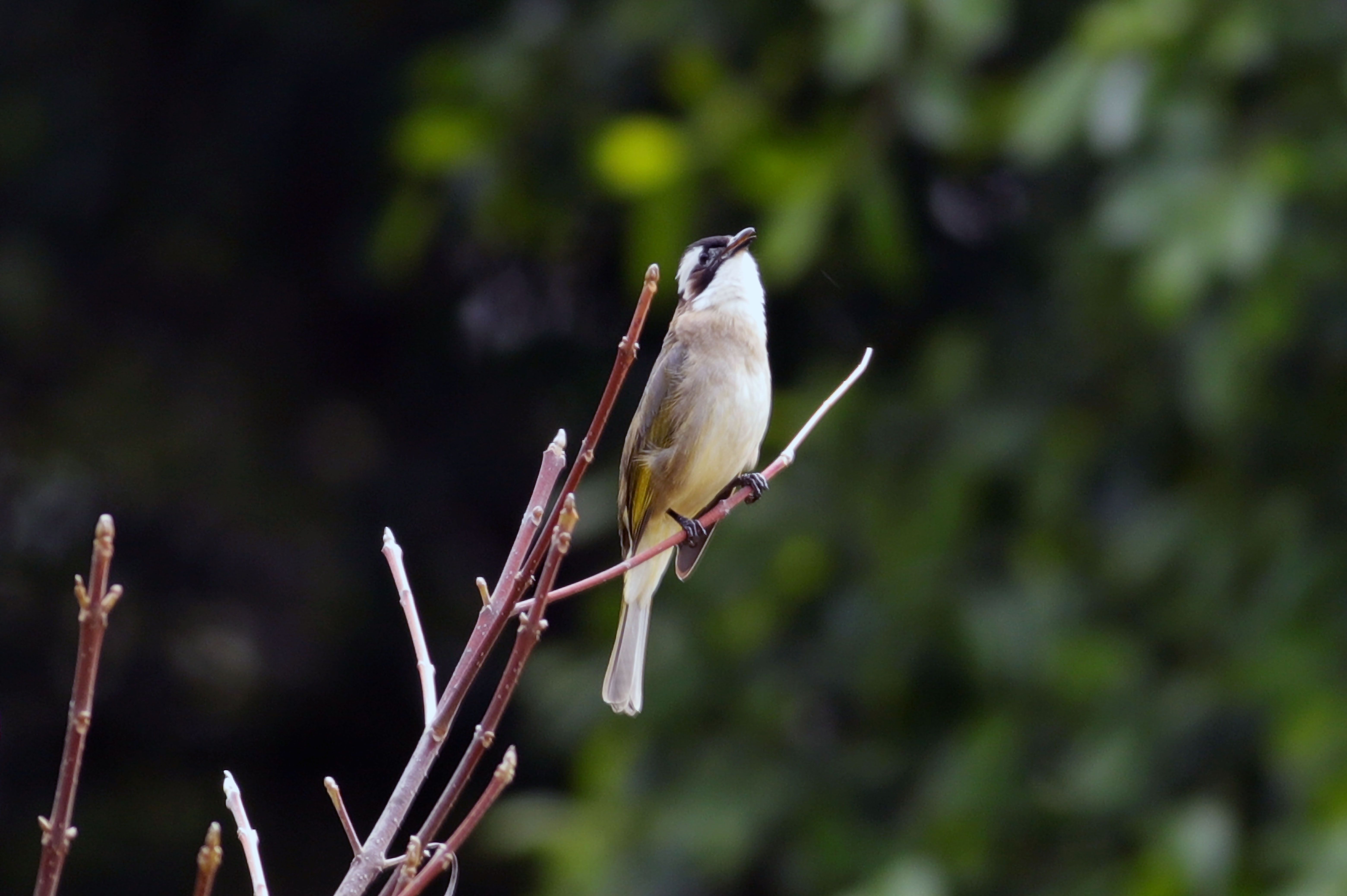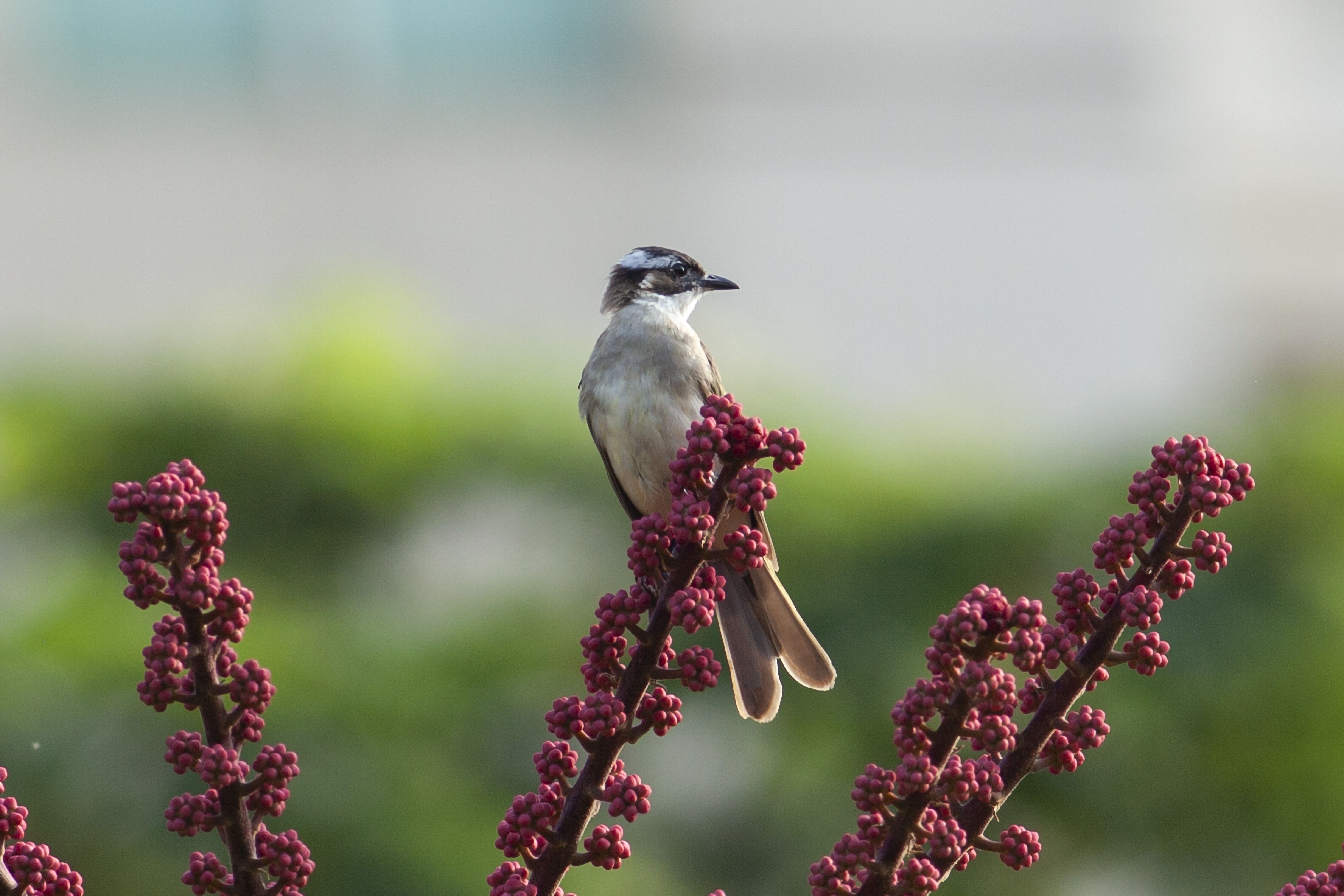 白头鹎(Pycnonotus sinensis)雀形目鹎科鸟类。体长17-22厘米,额至头顶纯黑色而富有光泽,头顶两侧自眼后开始各有一条白纹,上体褐灰或橄榄灰色、具黄绿色羽缘,尾和两翅暗褐色具黄绿色羽缘。 东莞地区留鸟,常呈3-5只至10多只的小群活动,多在灌木和小树上活动,性活泼,不甚怕人,常在树枝间跳跃,或飞翔于相邻树木间。 杂食性,既食动物性食物,也吃植物性食物。
