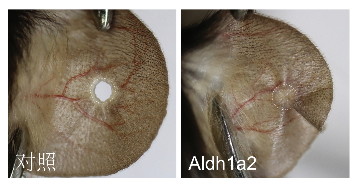在小鼠中表达视黄酸关键合成酶Aldh1a2可以完全恢复耳廓再生能力。王伟团队对家兔和小鼠耳廓损伤修复过程进行系统性比较研究,利用空间转录组测序、细胞谱系追踪等技术,精准解析了修复过程中细胞类型及基因表达的差异。研究发现,视黄酸是决定哺乳动物再生能力的关键“分子开关”,视黄酸生成不足会导致再生失败,而外源性补充视黄酸可激活再生。“视黄酸能调控基因表达、细胞分化及微环境信号,成为连接遗传调控与再生能力的核心枢纽。”王伟解释道。