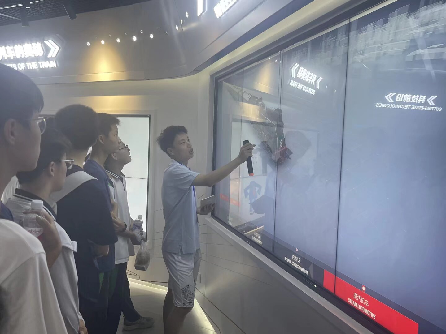 在轨道交通科普馆内,志愿者马彦俊通过实物模型和互动屏幕,向同学们展现了中南大学轨道交通学科的发展脉络,引发同学们对 "中国速度" 的热烈讨论。