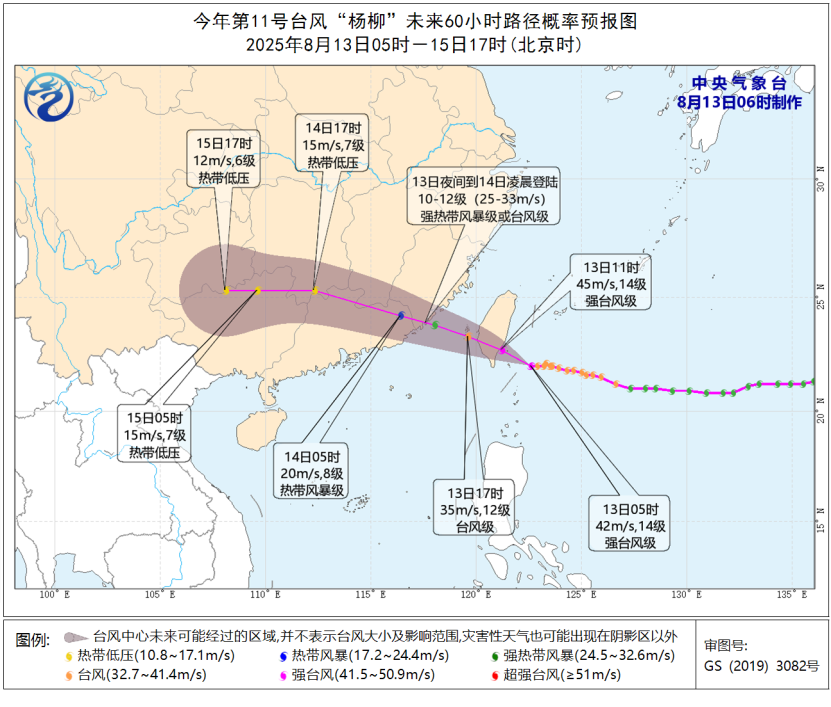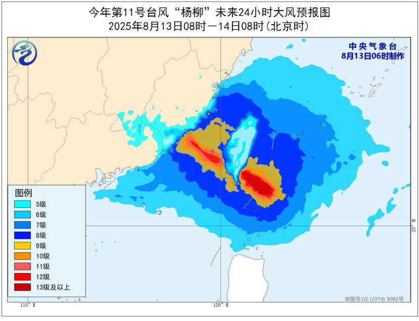 大风预报:8月13日08时至14日08时,东海南部、台湾以东洋面、南海东北部、巴士海峡、台湾海峡、台湾岛北部及其沿海、福建北部沿海、广东中东部沿海将有6~8级大风,台湾岛南部及其沿海、福建中南部沿海、台湾东南洋面、台湾海峡和巴士海峡的部分海域风力可达9~10级,台风中心经过的附近海域和地区风力有11~14级,阵风15-16级。