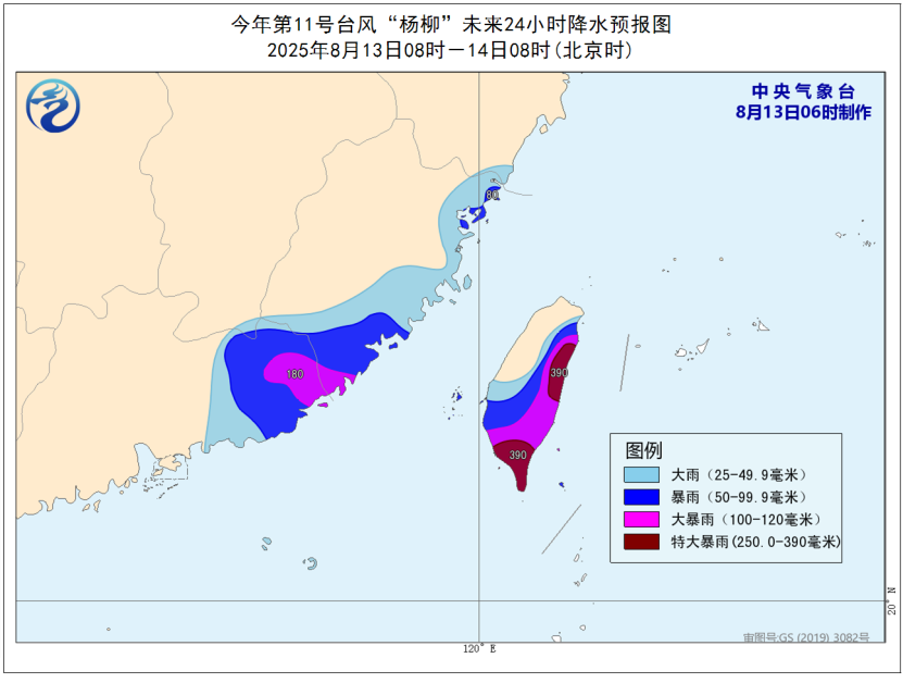 降水预报:8月13日08时至14日08时,广东东部、福建东部和南部、台湾岛大部等地有大到暴雨,其中,福建东南部、广东东南部、台湾岛东部和南部等地有大暴雨,台湾岛东部和南部的局地特大暴雨(250~390毫米)。
