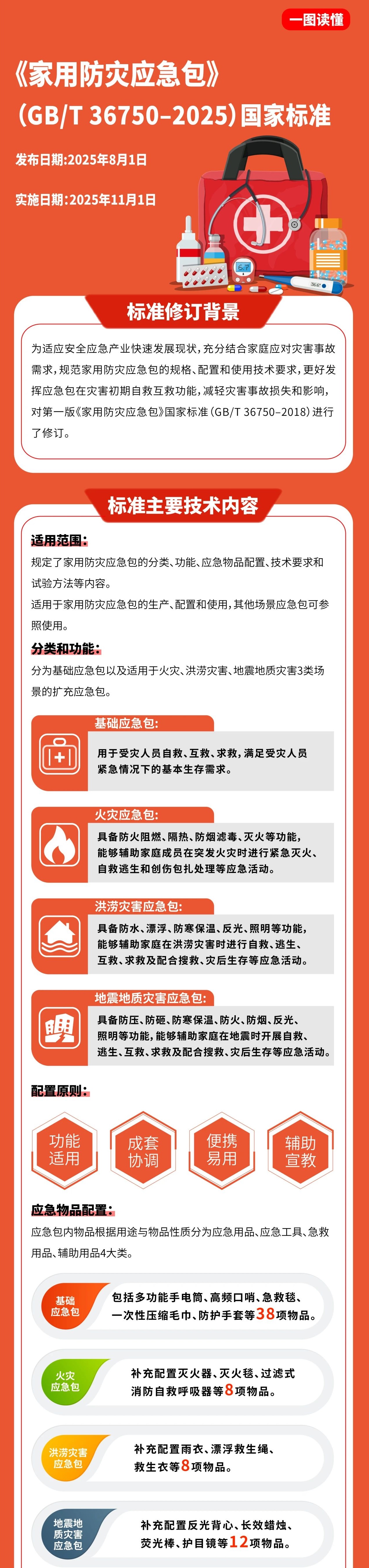近日,市场监管总局(国家标准委)修订发布《家用防灾应急包》国家标准(GB/T 36750—2025),将于2025年11月1日起正式实施。该标准旨在防御与减轻突发灾害事件影响,科学合理地配置个人、家庭应急救助用品,提高自救互救能力,支持遇险者尽快脱险。