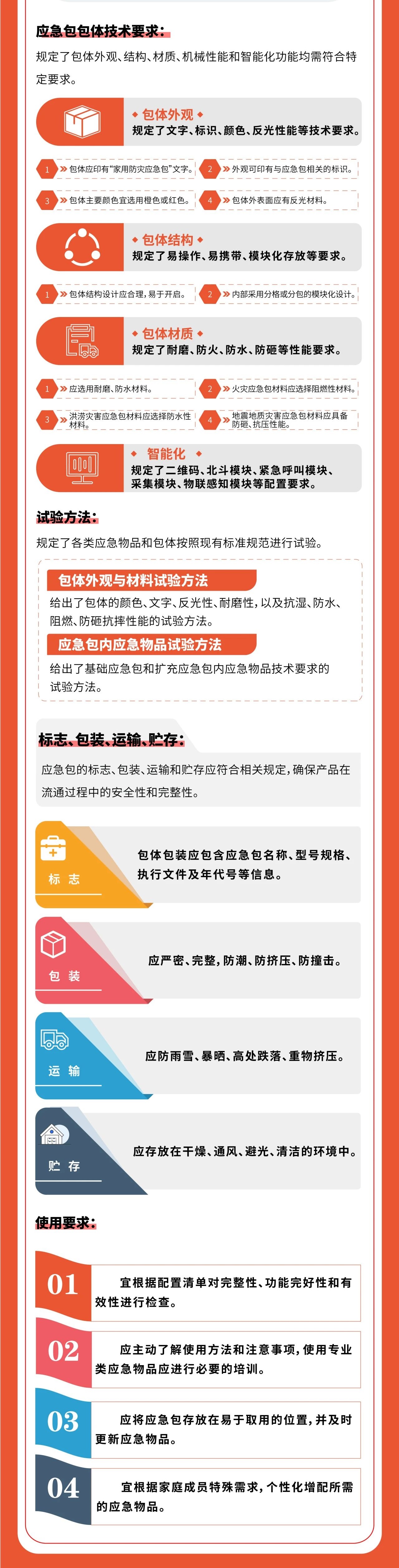 二是加严应急包的质量要求。应急包体作为应急物品的载体,对内部的应急物品起保护作用,标准提出了耐磨、耐腐蚀、防静电、抗撕裂、防水、抗跌落等方面性能要求。比如,应急包从1000mm的高度自由落下,应急物品物理机械性能、电气性能应正常,无机械损伤,紧固件无松动。