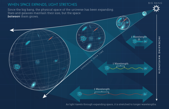 当光从很远的距离传播到哈勃望远镜时,随着宇宙的膨胀,它会被拉伸到越来越长的红色波长,或者说在发生红移。(图片来源:NASA)