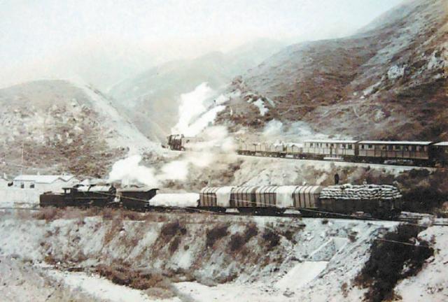 当年京张铁路青龙桥站,两列火车沿人字形铁路分别上山和下山场景