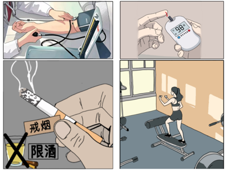大脑先生:“别害怕,我们趁血管壁堵塞的还不是很严重,及时治疗,会慢慢好起来的。首先我们需要主人管好自己的嘴,戒烟限酒,合理膳食,用新鲜蔬菜、水果等代替动物内脏、糖果、饮料等高胆固醇、高糖食物。其次,适当锻炼,比如快走、慢跑、游泳、骑自行车等有氧运动,不仅能够控制体重,还能增强心肺功能,一举两得!同时定期检测血压、血脂、血糖,能够及时发现问题并进行治疗。”