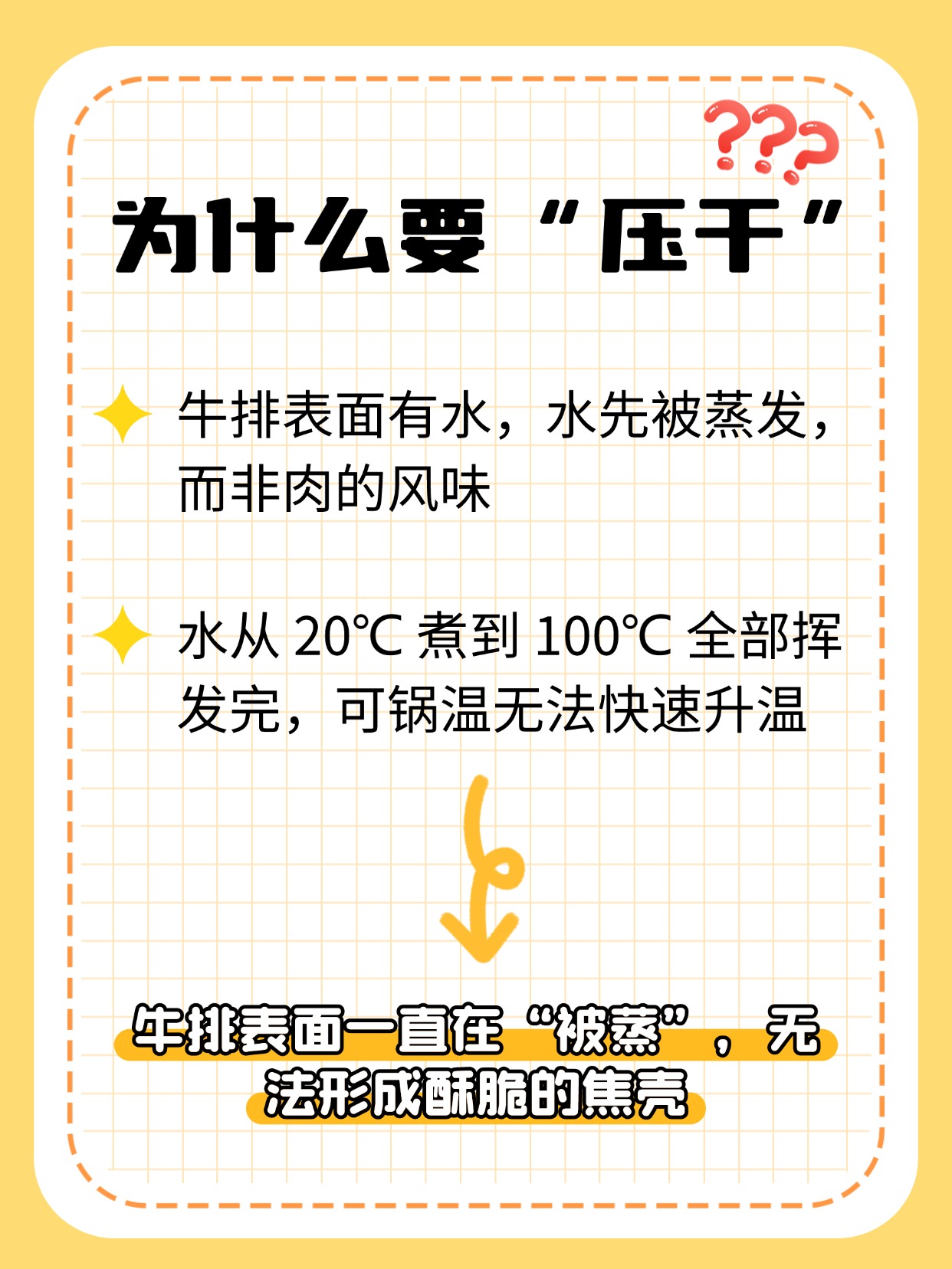 结果就是:牛排表面一直在“被蒸”,很难形成香脆的焦壳。