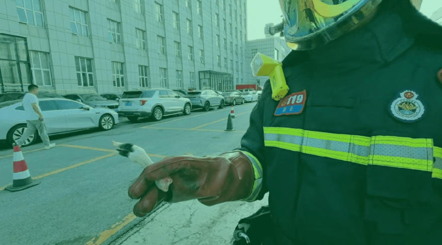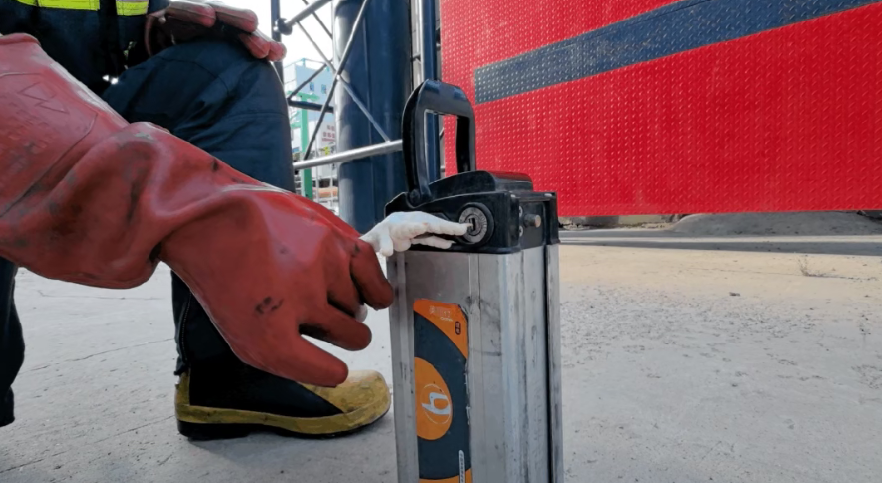 消防员用鸡爪模拟人手,将一个圆形铁片固定在鸡爪上。当铁片碰到电动车电池充电口处时,瞬间火花四溅。