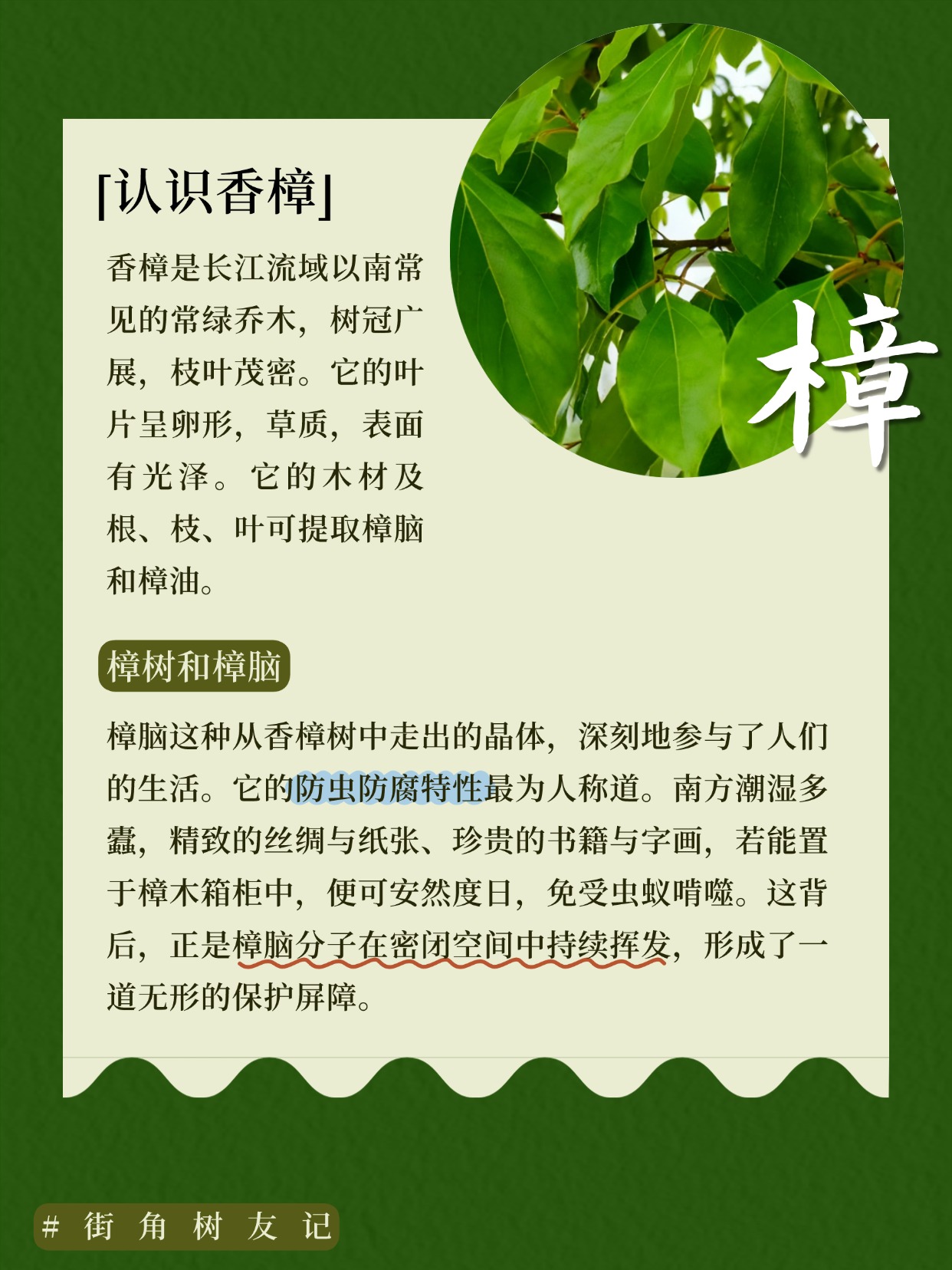 沿着江南的街巷行走,夏日里总会闻到一种清冽又带着几分药意的香气,抬头望去,枝叶茂密如盖的,常常便是香樟树。香樟是长江流域以南常见的常绿乔木,树冠广展,枝叶茂密。它的叶片呈卵形,草质,表面有光泽。它的木材及根、枝、叶可提取樟脑和樟油。