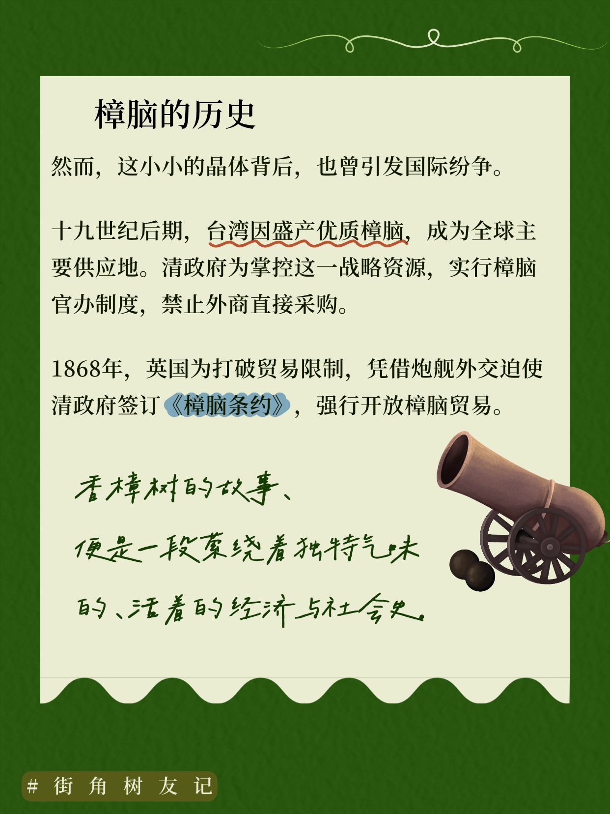 然而,这小小的晶体背后,也曾引发国际纷争。十九世纪后期,台湾因盛产优质樟脑,成为全球主要供应地。清政府为掌控这一战略资源,实行樟脑官办制度,禁止外商直接采购。1868年,英国为打破贸易限制,凭借炮舰外交迫使清政府签订《樟脑条约》,强行开放樟脑贸易。