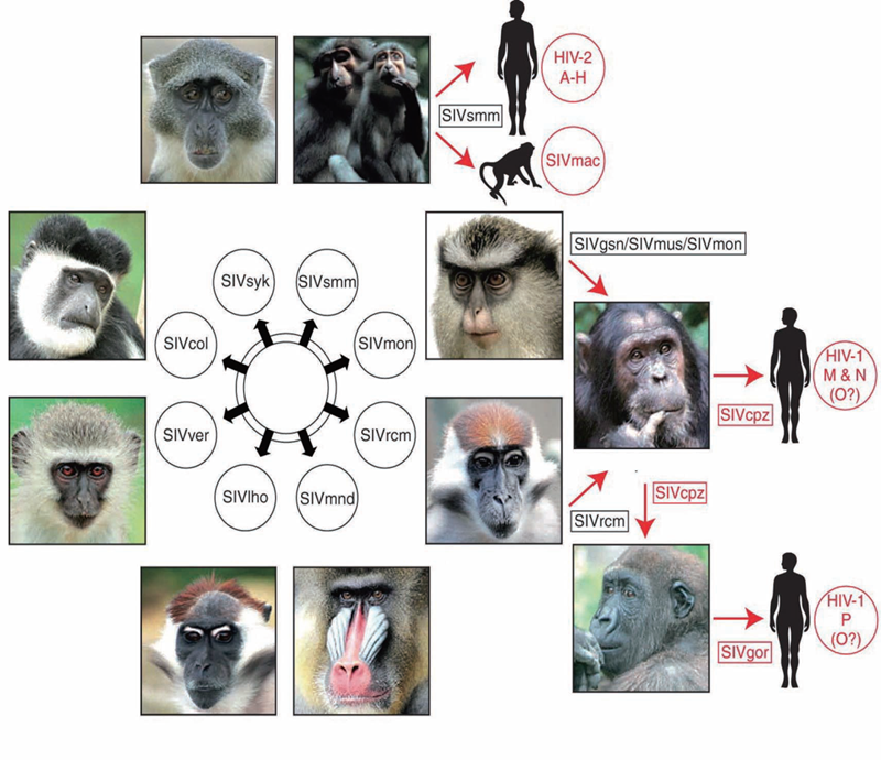 ▲目前已知,HIV-1源于黑猩猩身上的SIVcpz和大猩猩身上的HIVgor,而HIV-2则源于乌黑白眉身上的SIVsmm(图片来源/ CSH Perspect Biol, 冷泉港生物学展望)