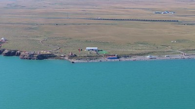 航拍青海湖断崖景区高原圣湖蓝天白云湖水