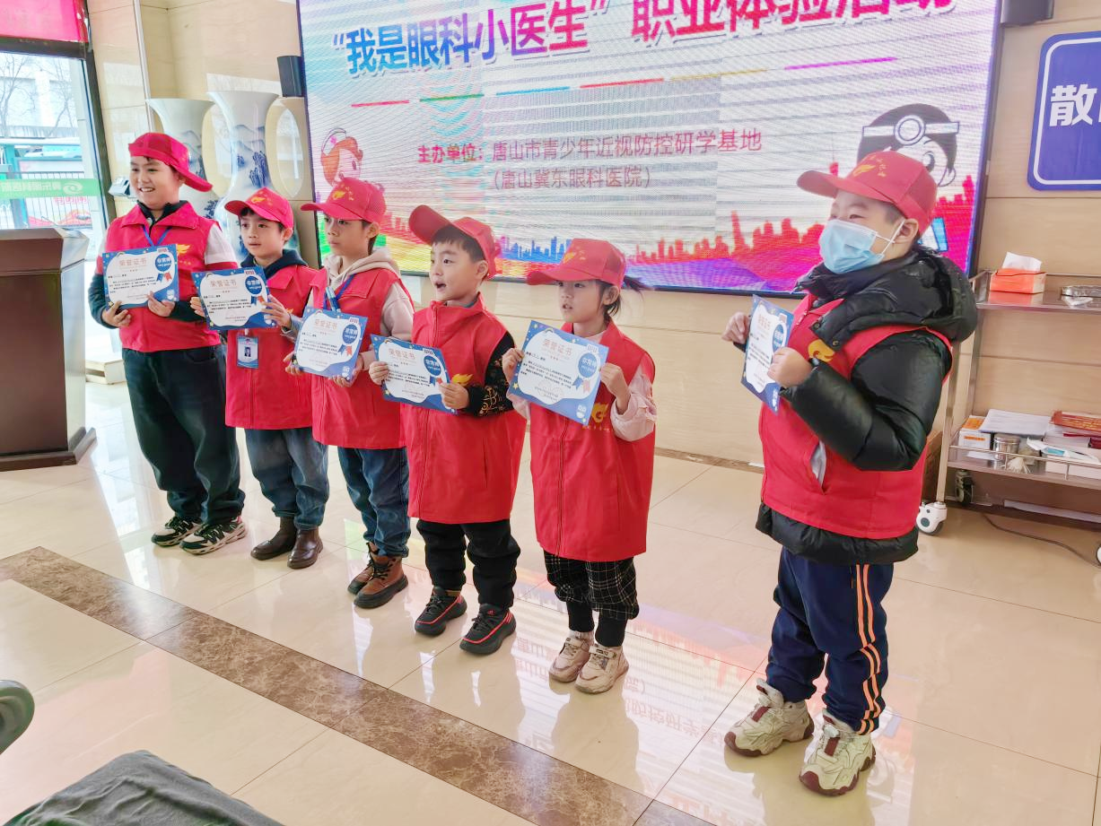 为强化家长保护学生视力的意识,强化学生“每个人是自身健康的第一责任人”的意识,普及青少年近视防控知识,引导青少年掌握科学护眼的方法,2025年寒假的第一个周六日,(2025年1月11日和1月12日(周六、日)下午2:30 )唐山市青少年视力干预协会、唐山青少年近视防控研学基地(唐山冀东眼科医院)与唐山市路北区实验小学联合举办了“我是眼科小医生”职业体验研学活动。活动中眼健康咨询师姚敏和副主任医师刘丽霞为现场的学生和家长做了近视防控知识科普讲座:如:什么是近视?近视有哪些症状?近视的危害,什么样的学习环境有利于用眼健康?高度近视要注意什么?有什么危害?为什么多参加户外活动,可以有效预防近视?阅读学习时,什么样的姿势是正确的?散瞳会伤害眼睛吗?等。在有奖知识竞答和学习测视力环节,同学们学习气氛浓厚,家长也积极参与抢答。体验结束后,同学们手持“爱眼小明星”证书快乐合影留念。