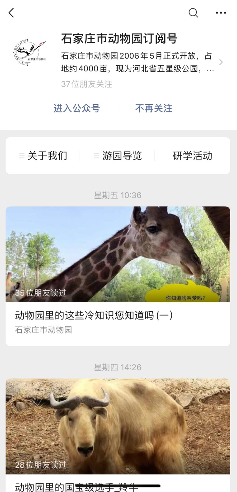 线上宣传:通过2个微信公众号平台(1.石家庄市动物园 2.石家庄市动物园订阅号),开展动物科普知识宣传。