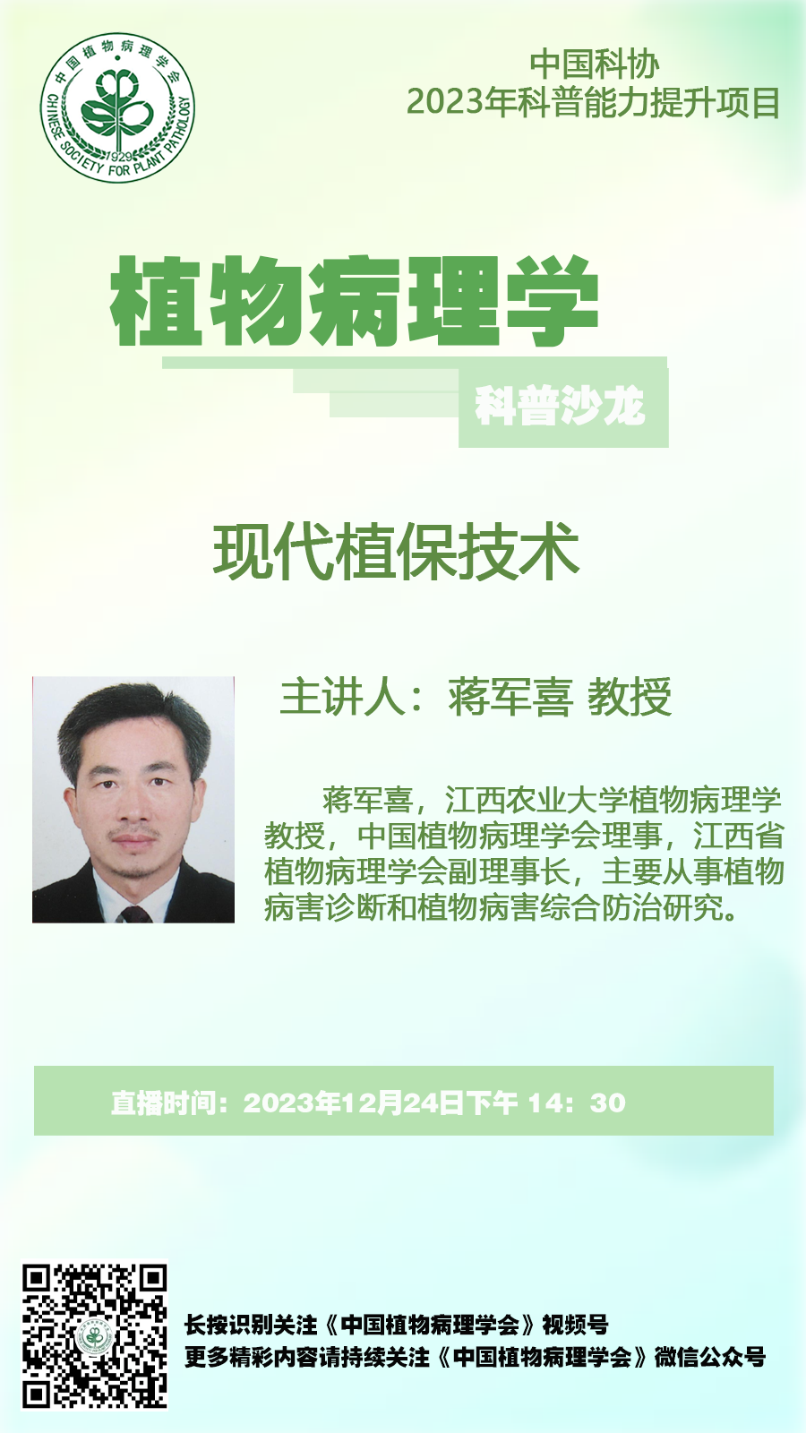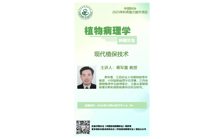 主讲人简介:蒋军喜,江西农业大学植物病理学教授,中国植物病理学会理事,江西省植物病理学会副理事长,主要从事植物病害诊断和植物病害综合防治研究。
